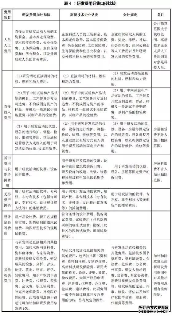 三是研發(fā)費(fèi)用加計(jì)扣除政策口徑的研發(fā)費(fèi)用,其主要目的是為了細(xì)化哪些研發(fā)費(fèi)用可以享受加計(jì)扣除政策,引導(dǎo)企業(yè)加大核心研發(fā)投入,因此政策口徑最小??杉佑?jì)范圍針對(duì)企業(yè)核心研發(fā)投入,主要包括研發(fā)直接投入和相關(guān)性較高的費(fèi)用,對(duì)其他費(fèi)用有一定的比例限制。應(yīng)關(guān)注的是,允許扣除的研發(fā)費(fèi)用范圍采取的是正列舉方式,即政策規(guī)定中沒有列舉的加計(jì)扣除項(xiàng)目,不可以享受加計(jì)扣除優(yōu)惠。